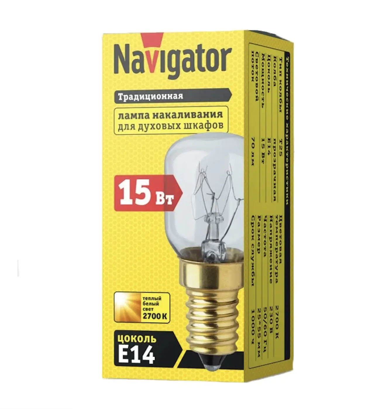 Лампа накаливания Navigator 15 Вт предназначена для использования в духовых печах. Выдерживает температуру окружающего воздуха до 300 °C. Цветность: естественный белый. Средний срок службы: 1000 ч