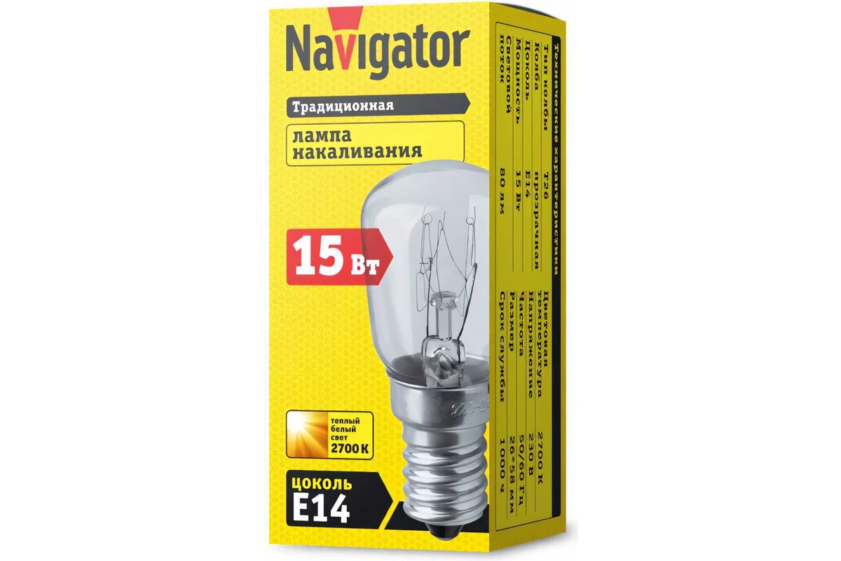 Лампа накаливания Navigator 15Вт с цоколем E14 предназначена для холодильников. Цветность: теплый белый. Средний срок службы: 1000 ч.