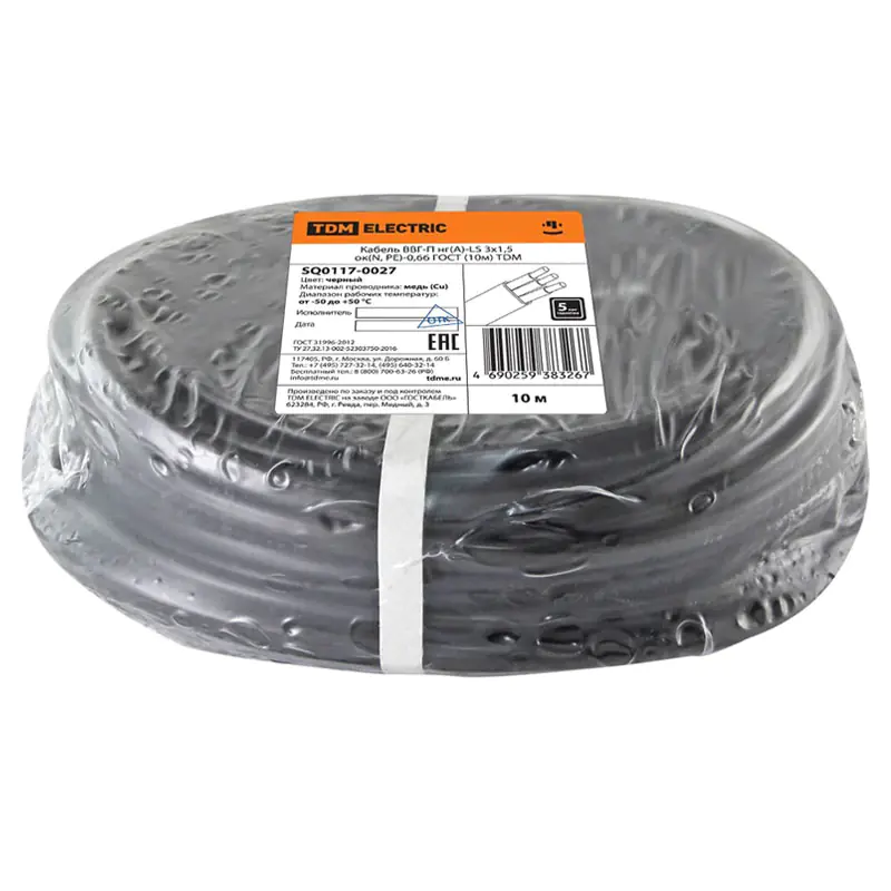 Кабель ВВГ Пнг(А)-LS 3х1,5 ок(N, PE)-0,66 ГОСТ TDM, 10 м