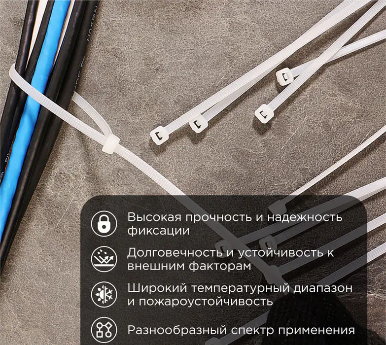 Хомут нейлоновый (кабельная стяжка) REXANT 300х3,6 мм – это крепежный элемент, представленный в виде стяжки, используется для герметизации и обвязки различных кабелей, проводов и других аналогичных изделий, является альтернативой проволоке, применяется при прокладке сантехнических систем, для крепления простых конструкций систем монтажа, гибких воздуховодов, электропроводки и выполнении других бытовых задач. Стяжки характеризуются как один из наиболее быстрых, удобных и экономически выгодных способов бандажирования, крепления и маркировки.