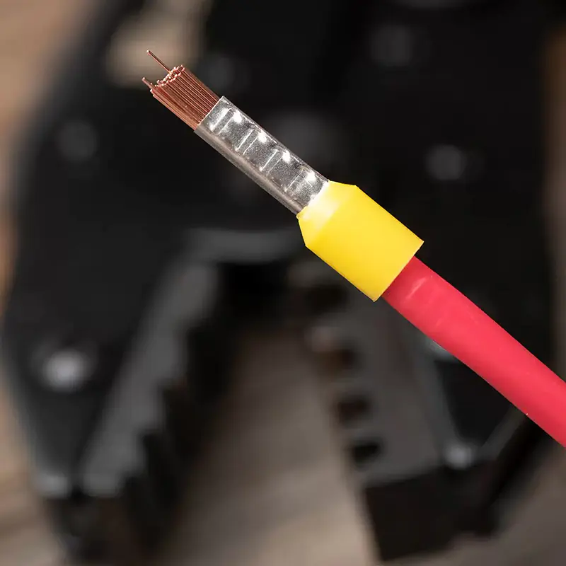 Процесс монтажа втулочного наконечника занимает несколько секунд. Предварительно зачищенная многопроволочная медная жила заводится внутрь втулки до упора (упор обеспечивается заходом провода в сужающийся раструб втулки до среза изоляции). Затем втулочная часть наконечника опрессовывается поверх втулки специальным инструментом. При опрессовке контактная часть многопроволочного провода, обжатая втулкой, образует единую монолитную конструкцию, а изолирующая манжета перекрывает изоляцию провода.
