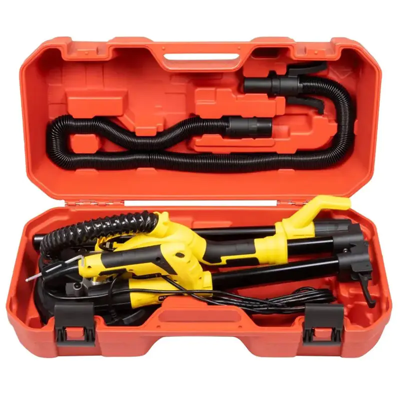 Данная шлифовальная машина имеет складываемый на шарнире из двух половинок корпус, позволяющий работать на отдалении 110 см от стены, и дополнительную вставку, увеличивающую длину оборудования до 170 см. Такой размер позволяет мастеру обрабатывать трехметровые потолки помещений без использования стремянки.