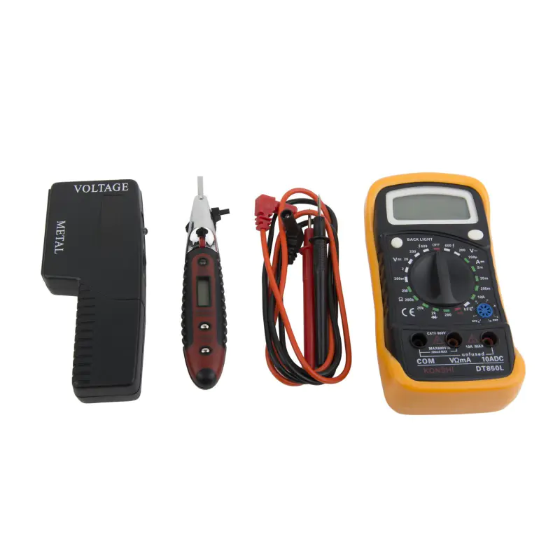 Цифровой мультиметр предназначен для измерения величины силы постоянного тока, постоянного и переменного напряжения, сопротивления, коэффициента усиления биполярных транзисторов, а также для проверки полупроводниковых диодов и прозваниванивания электрических цепей. Результат выводится на дисплей. Изделие работает от батарейки 9В типа "Крона". Тестер измеряет величины силы постоянного тока, постоянного и переменного напряжения, прозванивает электрические цепи. Детектор скрытой проводки позволяет определить наличие электропитания в стене на глубине до 40 мм. Набор выполнен из прочных и долговечных материалов и поставляется в блистере.