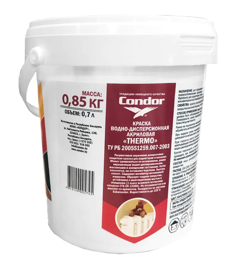 Эмаль Condor Thermo используется для окрашивания деревянных поверхностей и металлических деталей внутри помещений, ранее окрашенных водоразбавимыми, масляными или алкидными составами. Идеальна для обновления радиаторов отопления, а также предварительно загрунтованных новых металлических элементов внутри помещений.