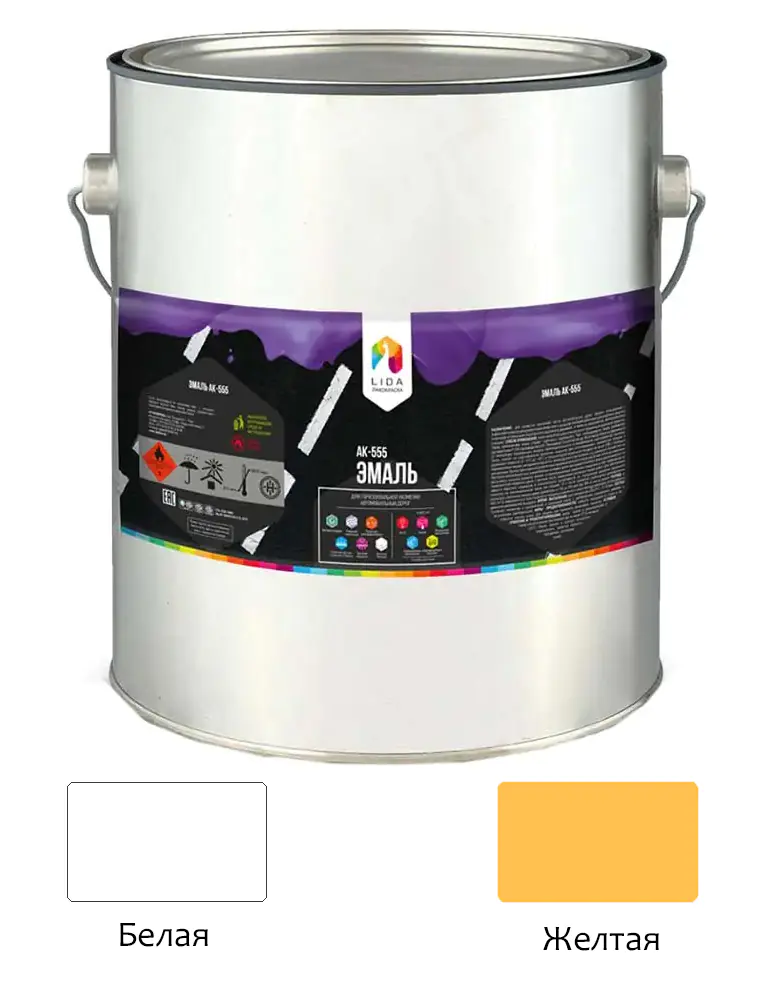 Эмаль АК-555 LIDA представляет собой суспензию пигментов и наполнителей в акриловой смоле с добавлением специальных добавок и органических растворителей. Предназначена для разметки проезжей части автомобильных дорог общего пользования с асфальтобетонным и цементобетонным покрытием с целью организации движения транспортных средств и пешеходов и повышения безопасности. Цвет: желтый. Вес 30 кг.