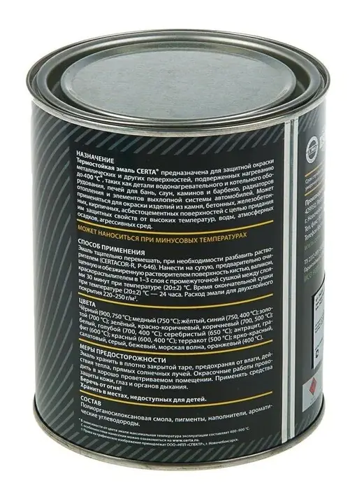 Предназначена для защитной антикоррозионной окраски металлического оборудования, работающего в условиях повышенной влажности и температуры, нефте-, газо-, паропроводов с перегретым паром, печей для саун, бань, дымовых труб.