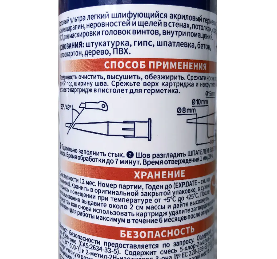 «АКРИЛ ШПАКЛЕВОЧНЫЙ БЫСТРЫЙ» может быть нанесен при помощи пистолета экструдера. После нанесения на поверхность или в шов, продукт может быть выровнен при помощи шпателя. Для достижения оптимального результата продукт следует наносить без излишнего давления на слой материала.