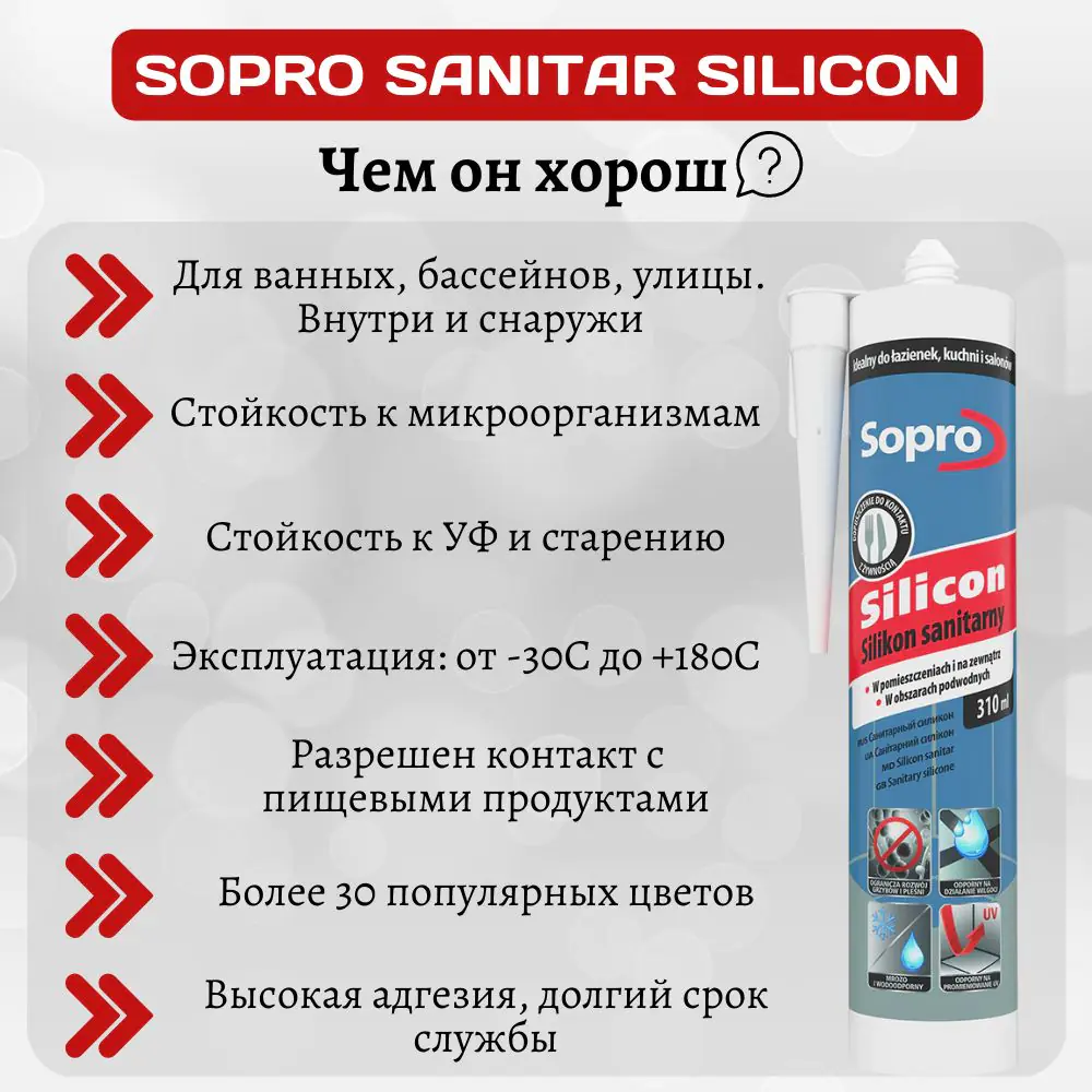 Sopro Sanitar Silicon 10 050 - cтруктурированный уксусной кислотой силиконовый герметик на основе каучука, предназначен для эластичного заполнения компенсационных швов. Цвет белый.