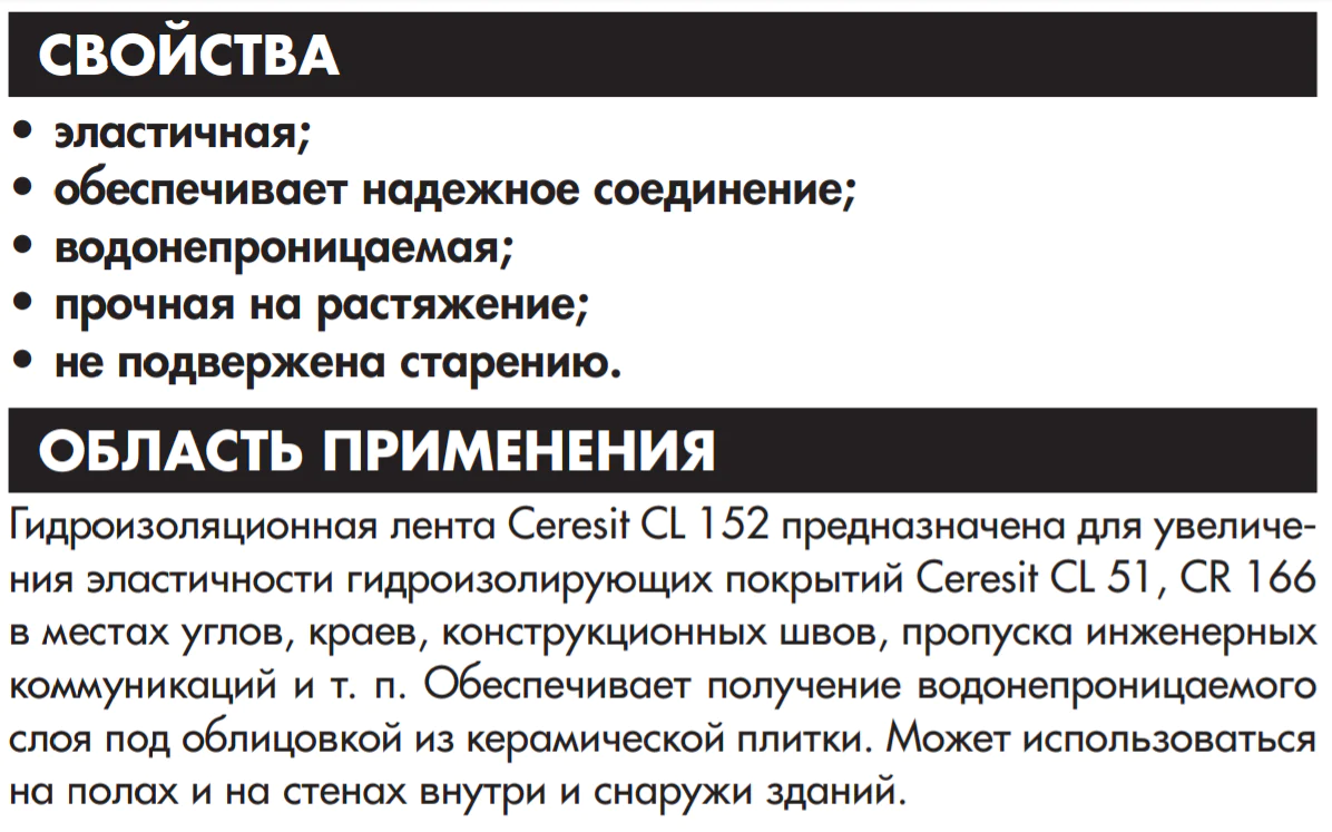 Лента Ceresit CL 152 предназначена для увеличения эластичности гидроизолирующих покрытий Ceresit CL 51, CR 166, CP 1 в местах углов, краев, конструкционных швов, пропуска инженерных коммуникаций и т.п. Обеспечивает получение водонепроницаемого слоя под облицовкой из керамической плитки. Может использоваться на полах и на стенах, внутри и снаружи зданий.
