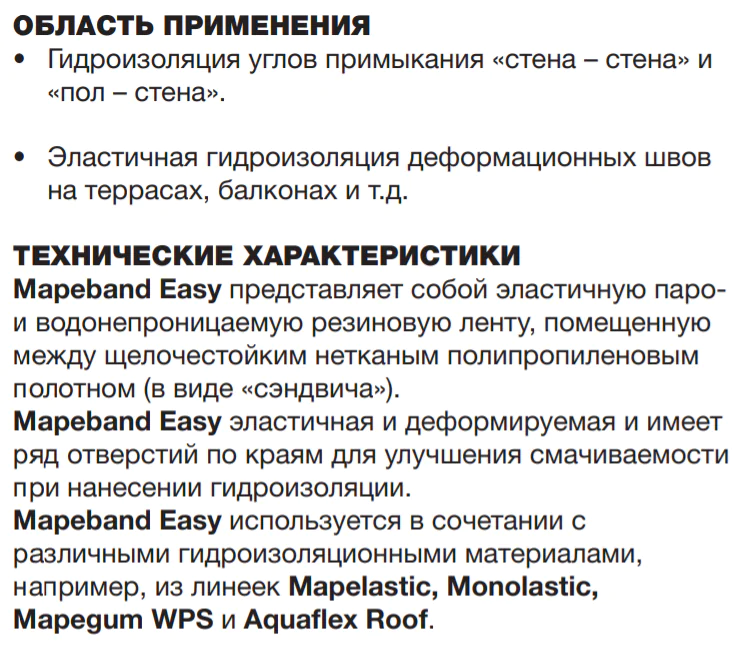 Гидроизолирующая лента Mapei Mapeband Easy длиной 10 м и шириной 130 мм для создания эластичных швов в системах гидроизоляции. Mapeband Easy эластичная и деформируемая и имеет ряд отверстий по краям для улучшения смачиваемости при нанесении гидроизоляции. Mapeband Easy используется в сочетании с различными гидроизоляционными материалами, например, из линеек Mapelastic, Monolastic, Mapegum WPS.