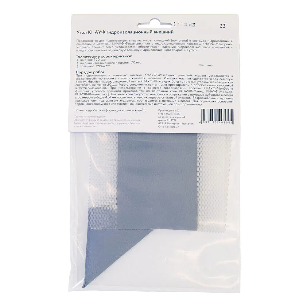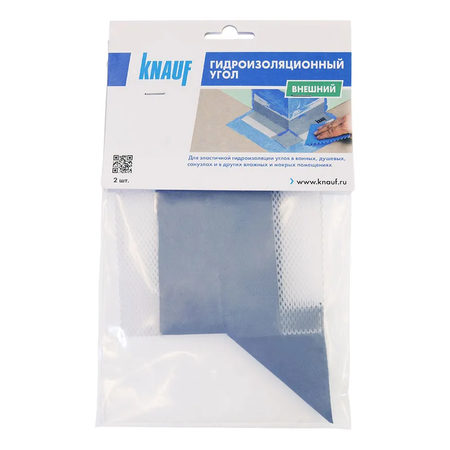 Внешний угол KNAUF Флэхендихтбанд надежно защитит от попадания воды углы в душевых, санузлах, ванных комнатах, банях, саунах, кухнях, теплицах и прочих помещениях с повышенной влажностью. Угловой элемент представляет собой эластомер, нанесенный на полиэфирную сетку и покрытый полиэфирным полотном с двух сторон. Эти материалы не пропускают влагу и защищают стыки и швы конструкций от плесени и разрушений. Гидроизоляционный угол прост в использовании и обеспечивает одинаковую толщину гидроизоляционного покрытия выпусков труб.