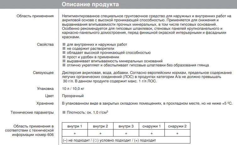 Грунтовка готова к применению и наносится в неразбавленном состоянии. При нанесении на сильно впитывающие поверхности грунт можно разбавить водой максимум на 10%.