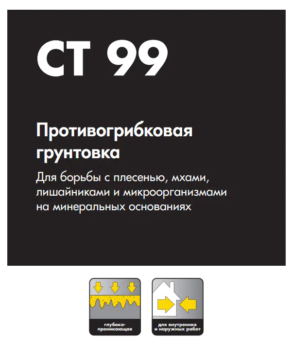 Все вышеизложенные рекомендации верны при температуре воздуха +20 °С и относительной влажности 60%. При других условиях время высыхания может измениться. Ceresit CT 99 содержит органические биоцидные препараты, раздражающе действующие на глаза, кожу и дыхательные пути, поэтому во время работы с материалом запрещается принимать пищу, пить или курить. Работы следует проводить в резиновых перчатках и защитных очках. При попадании препарата на кожу тщательно промыть загрязненный участок водой. При попадании препарата в глаза их следует промыть проточной водой в течение нескольких минут, а затем обратиться к врачу. Перед сдачей в эксплуатацию помещение проветрить до исчезновения запаха. Не допускать контакта препарата с продуктами питания. Хранить в недоступном для детей месте. Информация, приведенная в настоящем техническом описании, определяет область применения материала и способ проведения работ, но при этом не может заменить подготовки исполнителя работ. Кроме изложенной информации, при работе с материалом следует руководствоваться действующими нормативами в строительстве. При сомнении в возможности применения материала в конкретных условиях следует самостоятельно испытать его в достаточном количестве или обратиться за консультацией к производителю. Вышеизложенная информация не может служить основанием для безусловной ответственности производителя. Производитель не несет ответственности за применение материала в целях и условиях, не предусмотренных настоящим описанием.