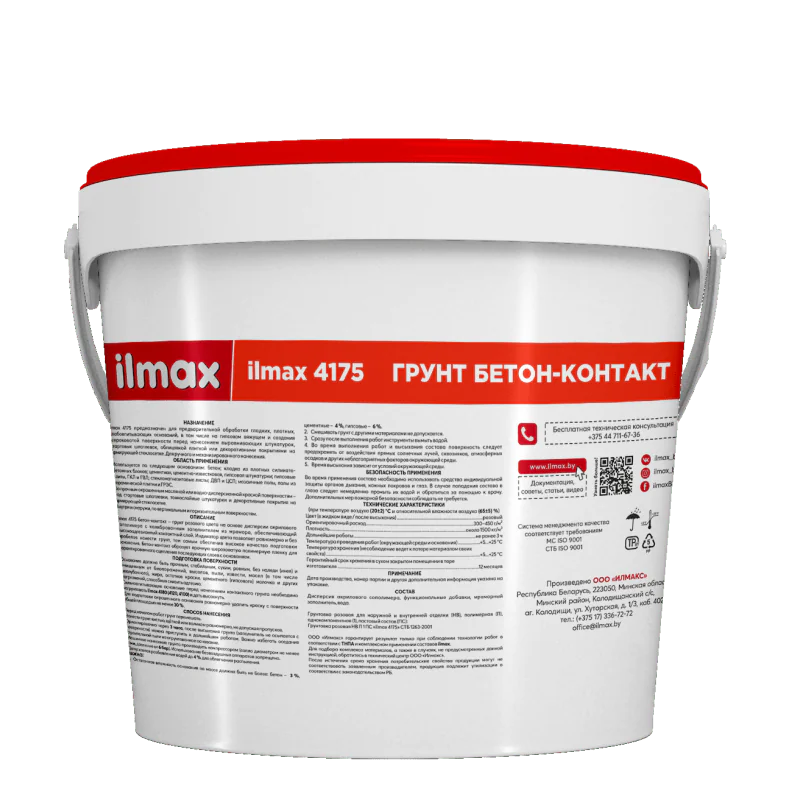 Грунт бетон-контакт ilmax 4175 предназначен для создания контактной поверхности перед нанесением: выравнивающих штукатурок; клеевых смесей; самонивелиров. Рекомендуется для нанесения на основания из: монолитного бетона, бетонных блоков и стен; мозаичных полов; плитки керамической и плитки ГРЕС; прочных малярных покрытий; гипсокартона, стекломагнезитовых листов; плит OSB, ДСП.