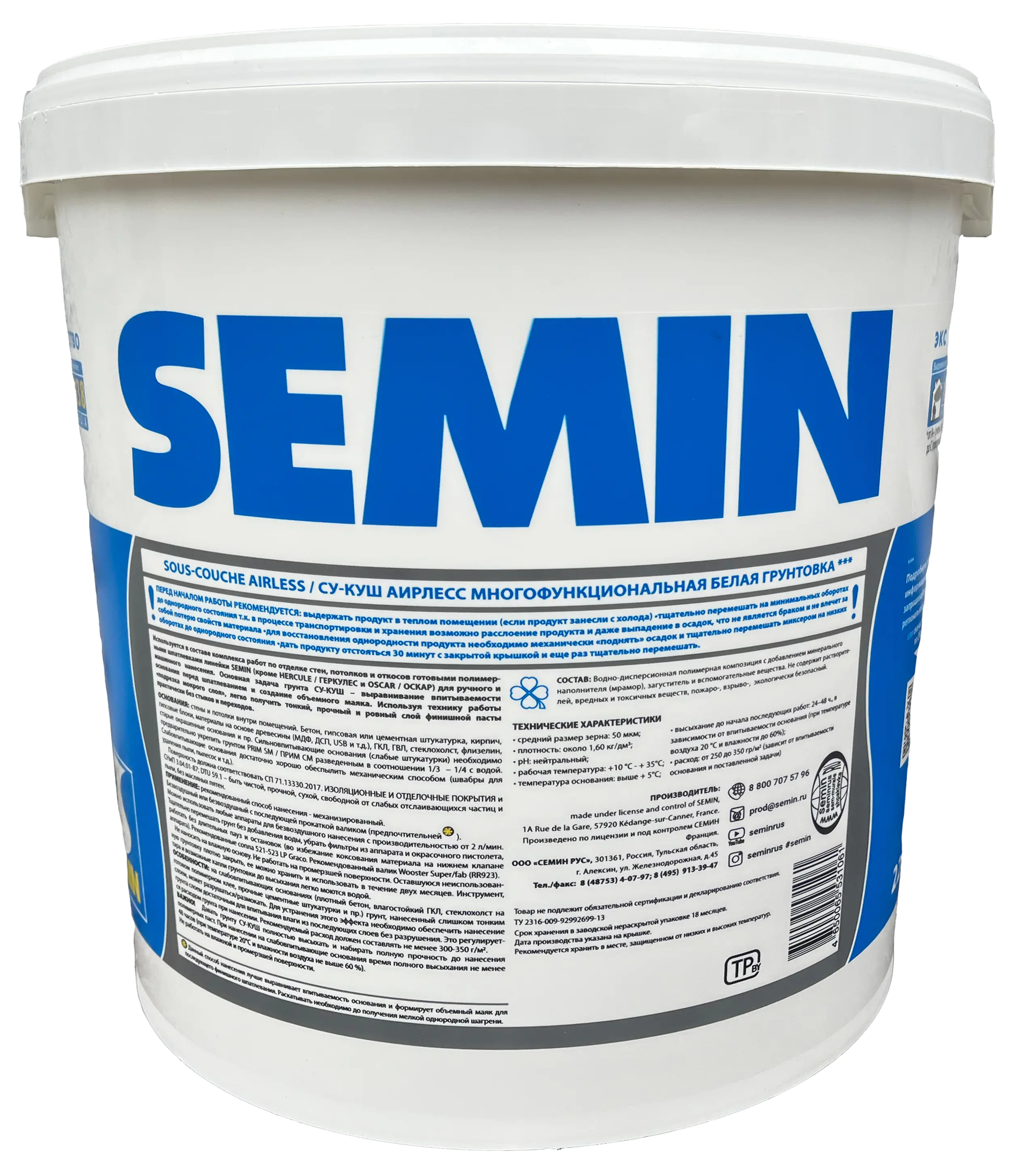 Специальная, не прозрачная/белая грунтовка Semin для подготовки основания к поклейке обоев, нанесению жидких обоев, декоративной отделке, покраске. Укрепляет и упрочняет основание, повышает адгезию финишного покрытия с основой, облегчает его нанесение. Может колероваться в цвет покрытия. Паропроницаемая. Предотвращает просвечивание основания через обои, краску, декоративную отделку. Позволяет осуществить последующее удаление обоев, без разрушения поверхности.