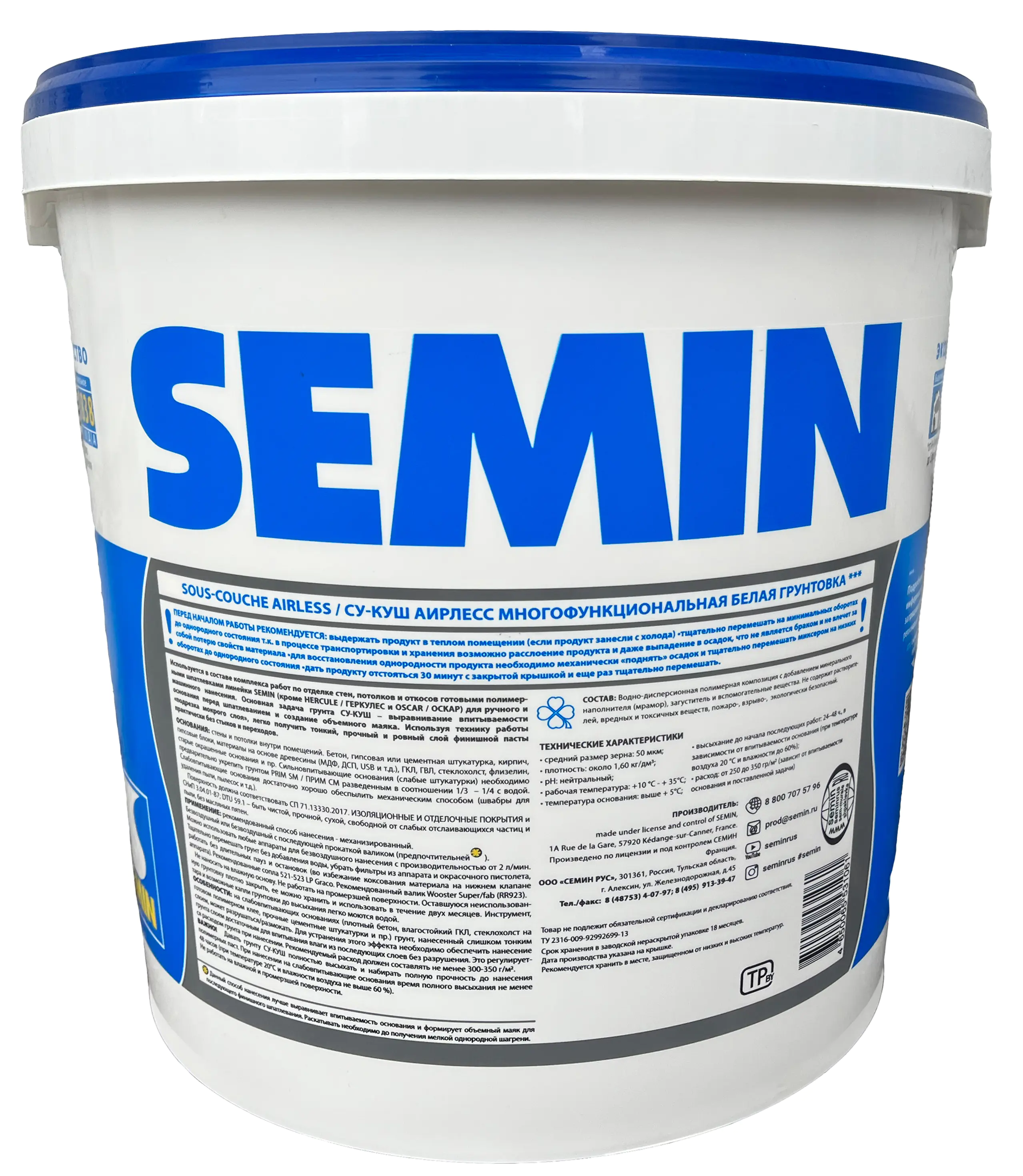Матовый грунт Семин Су Куш Аирлесс с синей крышкой – это готовый к применению продукт для нанесения как безвоздушными аппаратами, так и валиком. Предназначен для внутренних работ в сухих и влажных помещениях по самым разным основаниям: бетон, камень, кирпич, старые обои, ГКЛ, ДВП, ДСП, древесина, пенопласт, полистирол. Образует универсальное влагостойкое основание для поклейки обоев и других отделочных работ. Позволяет укрепить и упрочнить основание, нормализует впитываемость и выравнивает пористость.