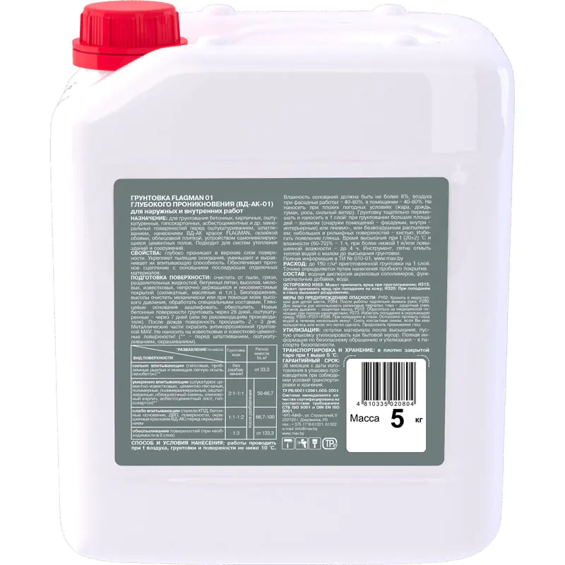 Грунтовка FLAGMAN 01 применяется для грунтования бетонных, кирпичных, оштукатуренных, гипсовых, гипсокартонных, асбестоцементных и других минеральных поверхностей с различной впитывающей способностью перед ремонтно-отделочными работами: оштукатуриванием, шпатлеванием, нанесением водно-дисперсионных красок, оклейкой обоями, облицовкой плиткой, устройством самонивелирующихся цементных полов. Возможно применение для систем утепления зданий и сооружений.