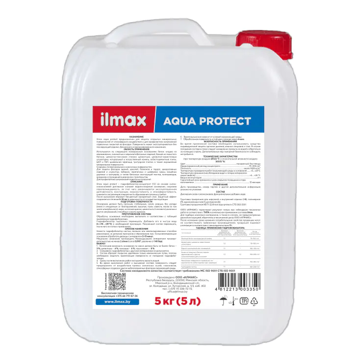 Состав ilmax aqua protect является концентратом. Перед приготовлением пропитки емкость с составом рекомендуется энергично встряхнуть, после чего смешивать с водой в соотношении до 1:2 (одна часть концентрата к двум частям воды) в зависимости от впитывающей способности основания (смотри ниже таблицу расходов). Для приготовления использовать чистую воду (t=+10…+25°C).