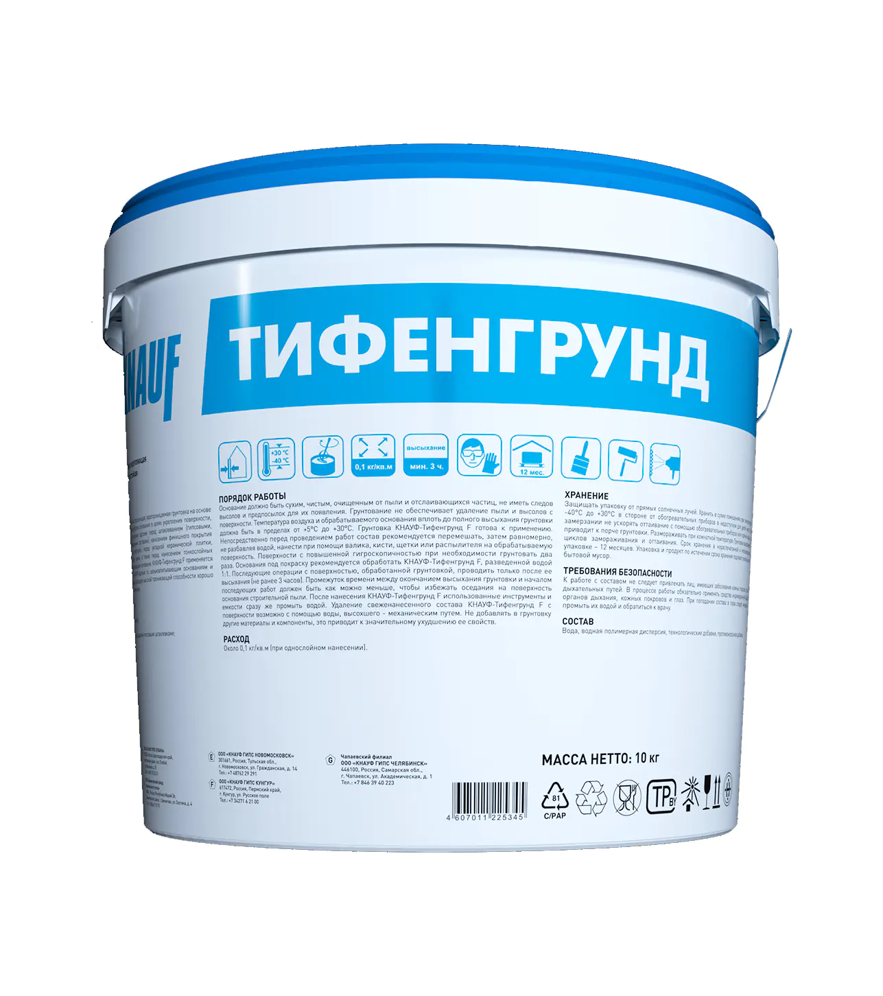Грунтовка КНАУФ-ТИФЕНГРУНД белого цвета предназначена для обработки основания в целях укрепления поверхности, снижения ее впитываемости и улучшения адгезии финишного покрытия (шпаклевки, краски, обои, облицовочной плитки и т.п.). Благодаря высокой проникающей способности подходит для грунтования мелкопористых материалов.