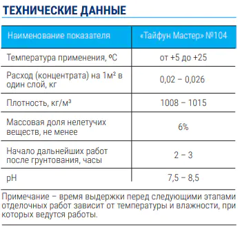 Тайфун Мастер» № 104 производится в виде концентрата. Перед использованием концентрат грунтовки разбавить чистой водой в требуемом соотношении и тщательно перемешать с целью