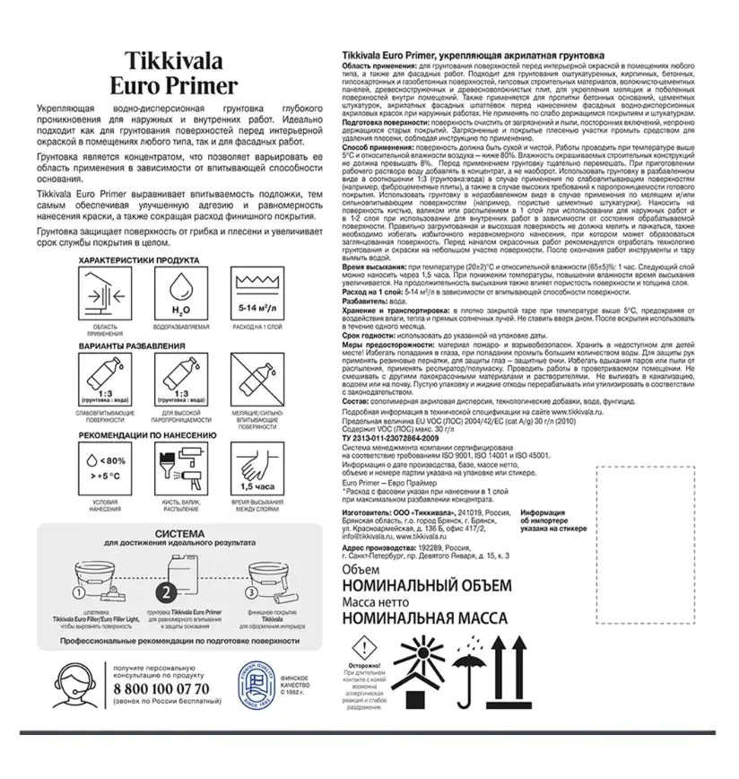 TIKKIVALA Euro Primer предназначен для грунтования поверхностей перед интерьерной окраской в помещениях любого типа, а также для фасадных работ. Подходит для грунтования оштукатуренных, кирпичных, бетонных, гипсокартонных и газобетонных поверхностей, гипсовых строительных материалов, волокнисто-цементных панелей, древесностружечных и древесноволокнистых плит, для укрепления мелящих и побеленных поверхностей внутри помещений. А также для пропитки бетонных оснований, цементных штукатурок, акрилатных фасадных шпатлёвок перед нанесением фасадных водно-дисперсионных акриловых красок при наружных работах. Не рекомендуется для применения по слабо держащимся покрытиям и штукатуркам.