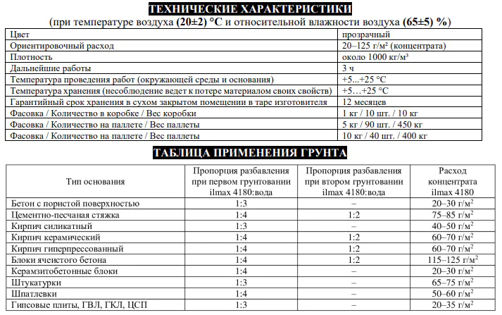 ilmax 4180 является концентратом. Перед приготовлением раствора грунт тщательно перемешивается и смешивается с водой в соотношении от 1:2 до 1:4 в зависимости от впитывающей способности основания. Для приготовления использовать чистую воду (t=+10…+25°C).