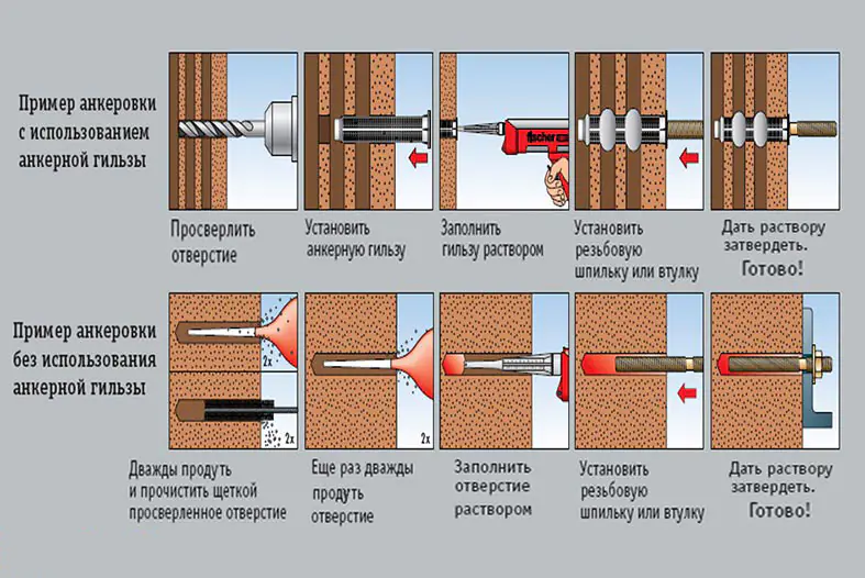 Крепление с помощью распорного анкера выполняется в строительных материалах с плотной внутренней структурой (бетон, природный камень, полнотелый кирпич и др.).