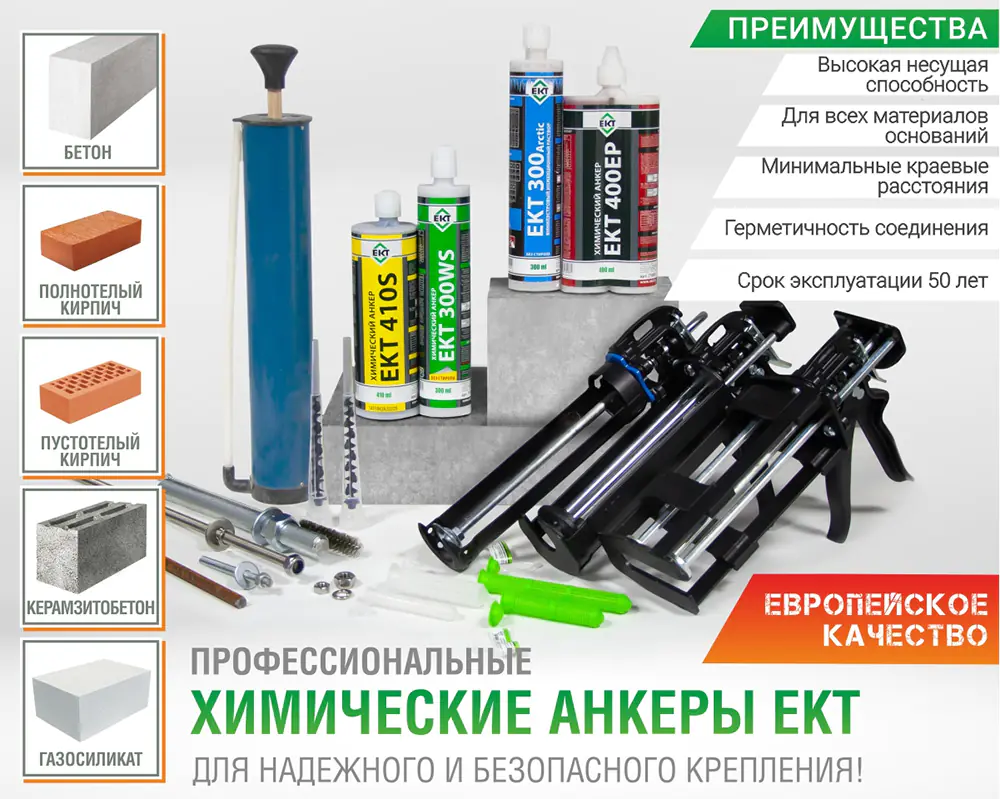 EKT 300 WS – двухкомпонентный химический состав для анкерных креплений. Предназначен для использования в пустотелых и полнотелых основаниях, в сухих и влажных условиях в диапазоне средних и высоких нагрузок. Раствор без содержания стирола, не обладает резким запахом, может монтироваться внутри помещений.