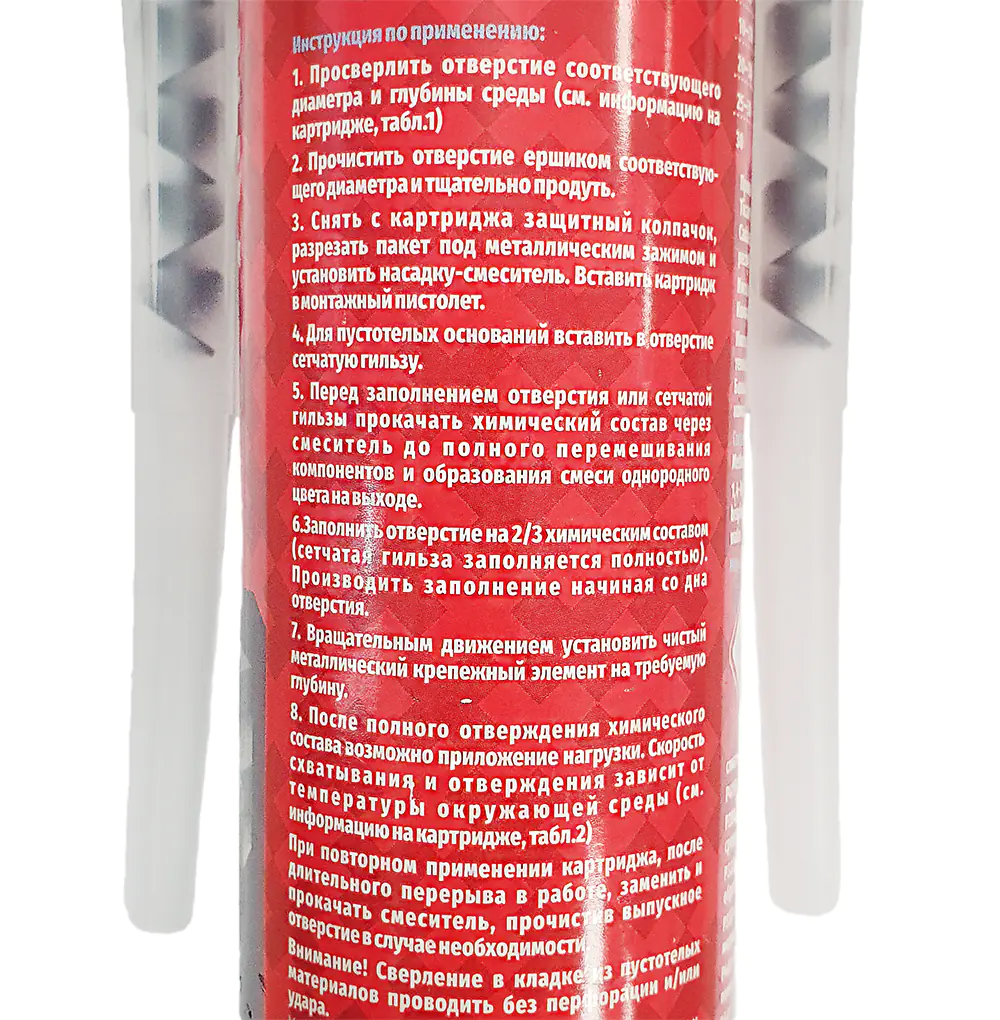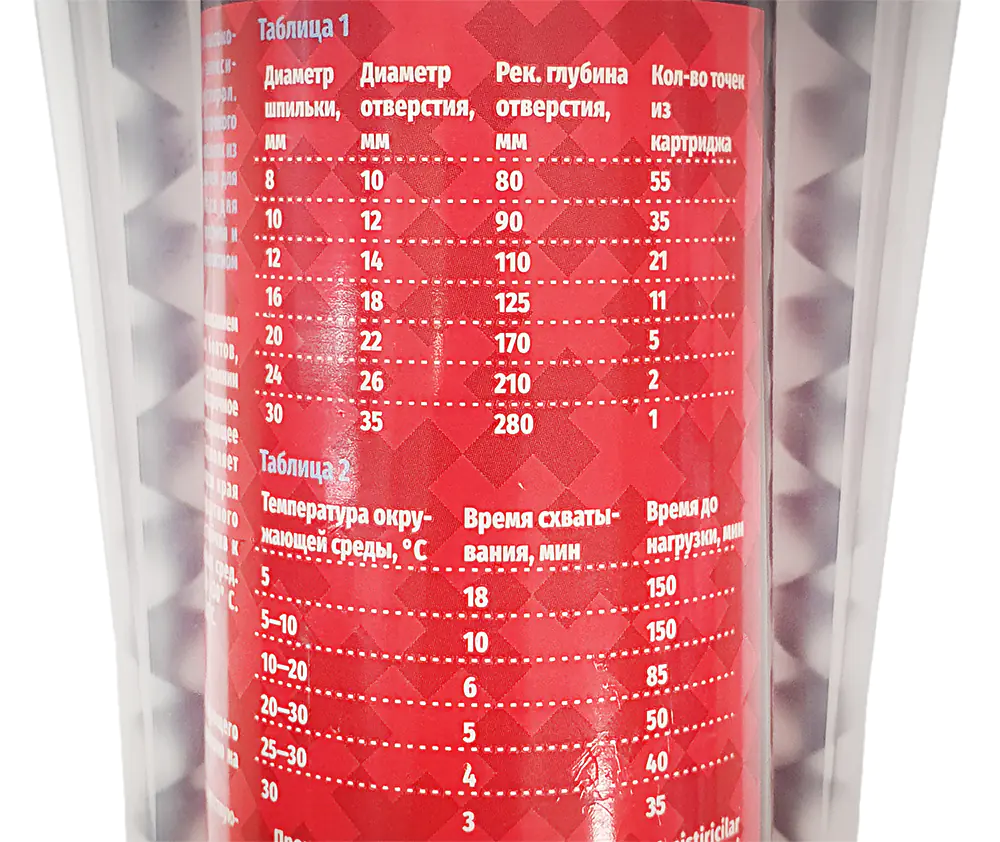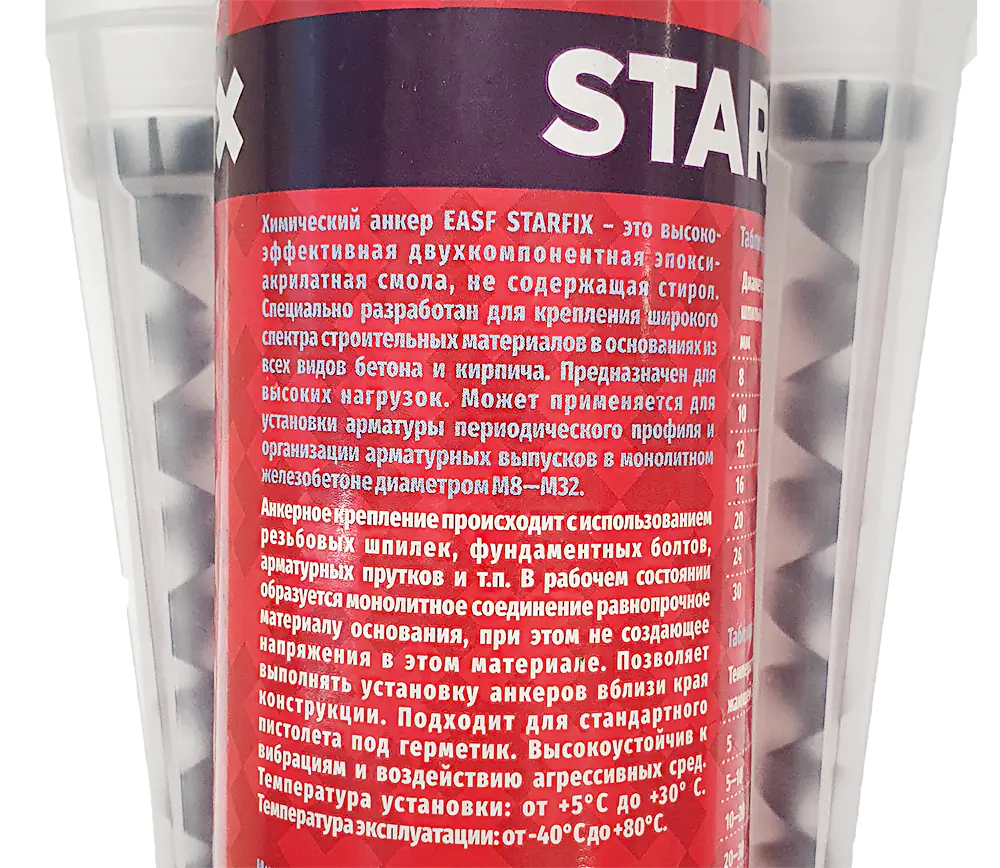Анкерное крепление происходит с использованием резьбовых шпилек, фундаментных болтов, арматурных прутков и т.п. В рабочем состоянии образуется монолитное соединение равнопрочное материалу основания, при этом не создающее напряжения в этом материале. Позволяет выполнять установку анкеров вблизи края конструкции. Подходит для стандартного пистолета под герметик. Высокоустойчив к вибрациям и воздействию агрессивных сред. Экологически нейтральный продукт. Температура установки: от +5°C до +30° C. Температура эксплуатации: от -40°C до +80°C.