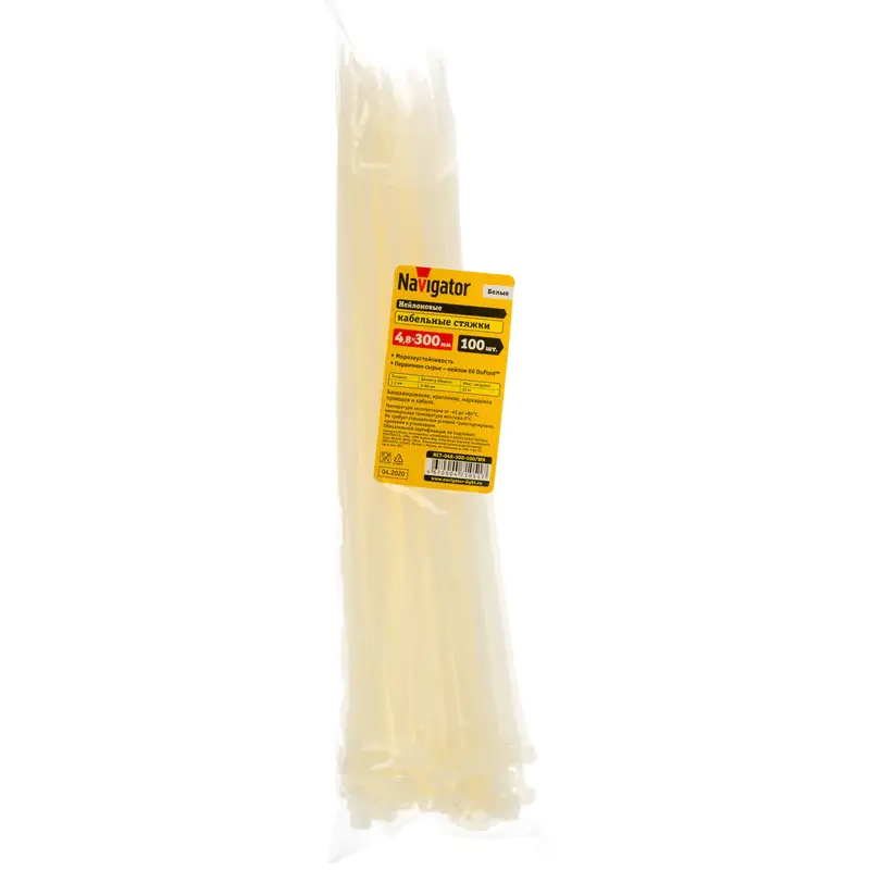 NCT-048-300-100/WH предназначены для увязки в пучок и монтажа кабелей и проводников. Хомуты изготовлены из негорючего нейлона и обладают стойкостью к щелочам, органическим растворителям и горюче-смазочным материалам. Температура эксплуатации кабельных стяжек от −40 до +80 °C. Ширина хомута составляет 4,8 мм, а его длина — 300 мм. В упаковке 100 штук.