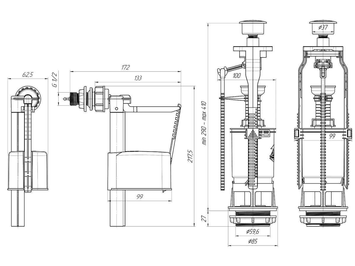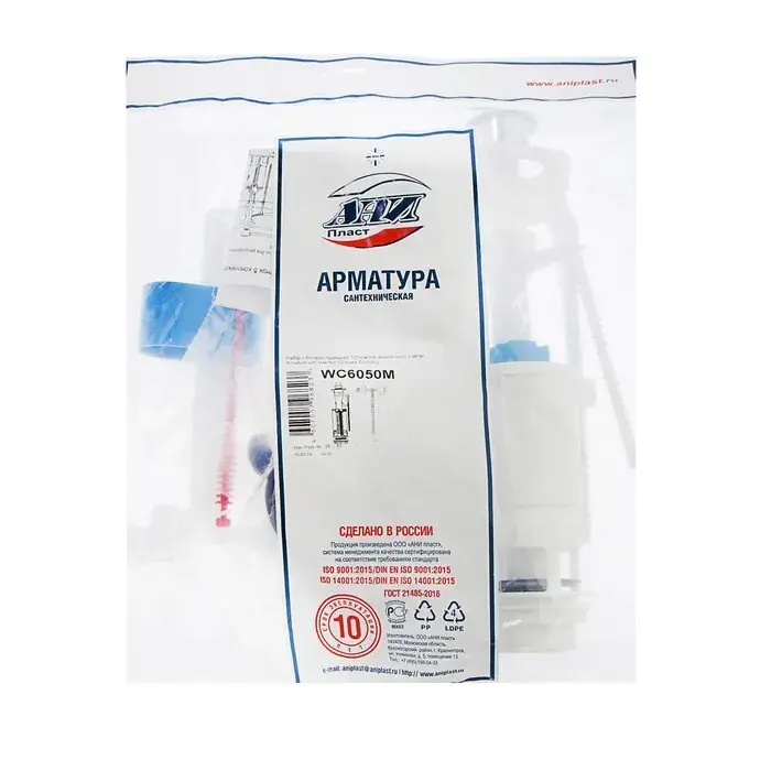 Набор для бачка унитаза АНИ пласт WC6050M эконом. Наливной механизм с верхней боковой подводкой и пластиковой резьбой диаметром 1/2". Сливной механизм металлизированная кнопка со штоковым режимом слива, регулировка по высоте 290-410 мм. Отверстие для кнопки слива в крышке бачка 40 мм, посадочное отверстие сливной арматуры 60 мм. Арматура является важным механизмом, необходимым для правильной работы сливного бачка. Изделие произведено из высококачественного пластика, который обеспечивает длительную эксплуатацию без поломок.