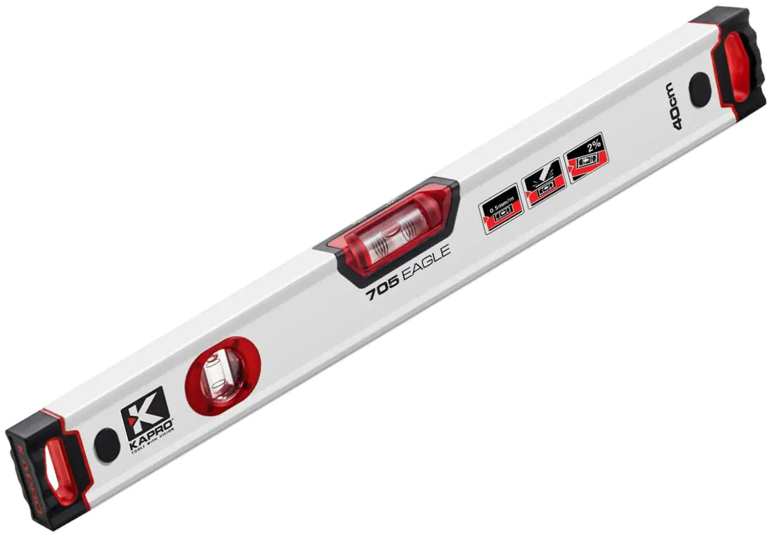 Уровень KAPRO Eagle 400 мм (705-40-40) с 2 полиакриловыми ударопрочными колбами, включая: красную горизонтальную колбу Optivision® Red и вертикальную колбу. Мостовой элемент конструкции над горизонтальной колбой для повышения прочности, делает конструкцию ровной для непрерывной разметки. Амортизирующие двухкомпонентные торцевые заглушки. Выносные противоскользящие элементы.