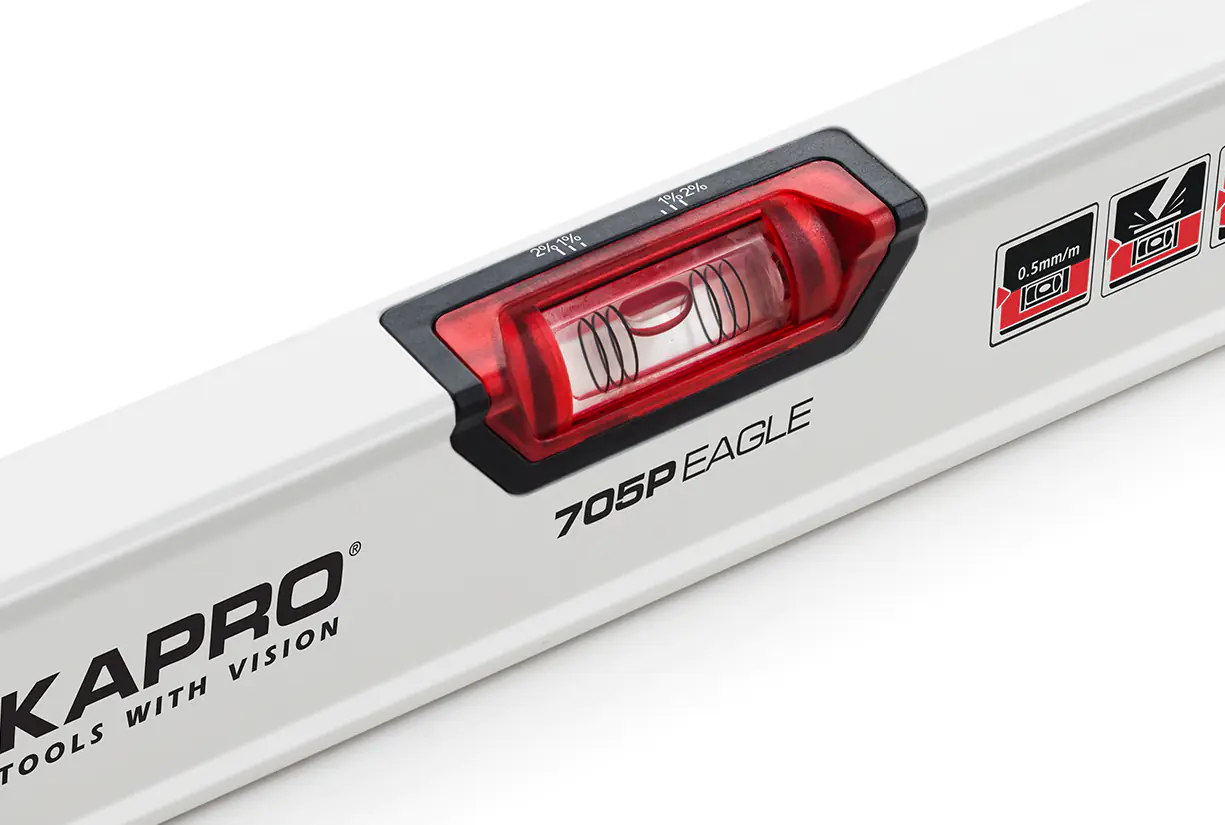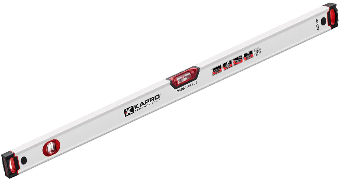 Уровень KAPRO Eagle 800 мм с 2 полиакриловыми ударопрочными колбами, включая: красную горизонтальную колбу Optivision® Red и вертикальную колбу. Мостовой элемент конструкции над горизонтальной колбой для повышения прочности, делает конструкцию ровной для непрерывной разметки. Амортизирующие двухкомпонентные торцевые заглушки. Выносные противоскользящие элементы.
