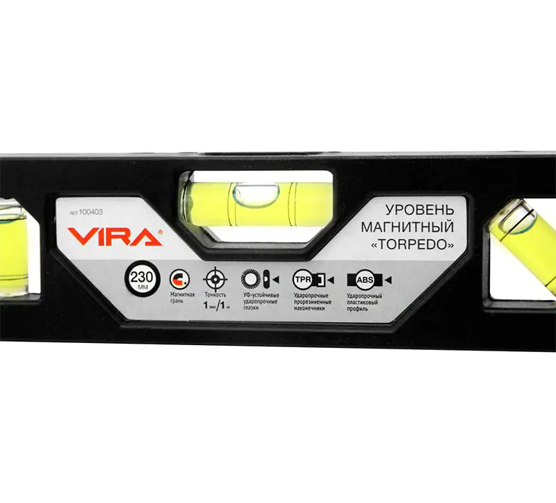 Корпус уровня магнитного VIRA выполнен из ударостойкого ABS пластика позволяет ронять инструмент на твердую поверхность с высоты до 3 метров безо всяких опасений. Точность измерений при этом не сбивается. Позволяет работать на металлических поверхностях без помощи рук за счет магнитной грани по всей длине профиля.
