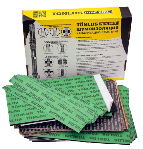Оба материала комплекта TONLOS PIPE PRO является самоклеящимся и не требует использования дополнительных клеевых материалов. Материалы не нуждаются в подгонке и уже на заводе вырезаны в размер для стандартной канализационной трубы Ø110 мм. В комплекте предусмотрены специальные листы для раструбов, компенсаторов, тройников и ревизий с нанесенной перфорацией, которая помогает быстро и точно сформировать отверстие для отводящего патрубка (Ø110 мм, Ø50 мм) или ревизионного лючка. Для достижения максимальной шумоизоляции в комплекте предусмотрены специальные звукоизоляционные самоклеящиеся ленты для изоляции стыков. Комплект предназначен для труб длиной до 3,2 м.