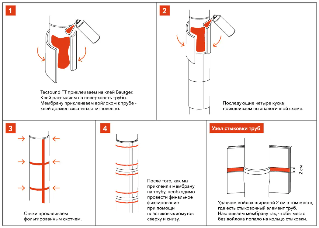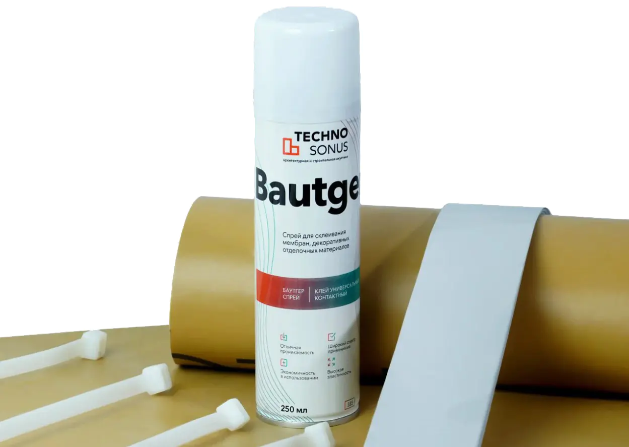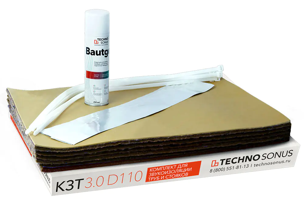 Основным элементом набора является комбинированная мембрана, предназначенная для профессиональной звукоизоляции. Материал позволяет добиться высоких показателей по снижению структурного и воздушного шума. Аэрозольный формат клея Баутгер даёт возможность быстро и экономично наносить его на поверхности даже в труднодоступных местах. КЗТ 3.0 D110 содержит всё необходимое для выполнения монтажа и готов к работе.