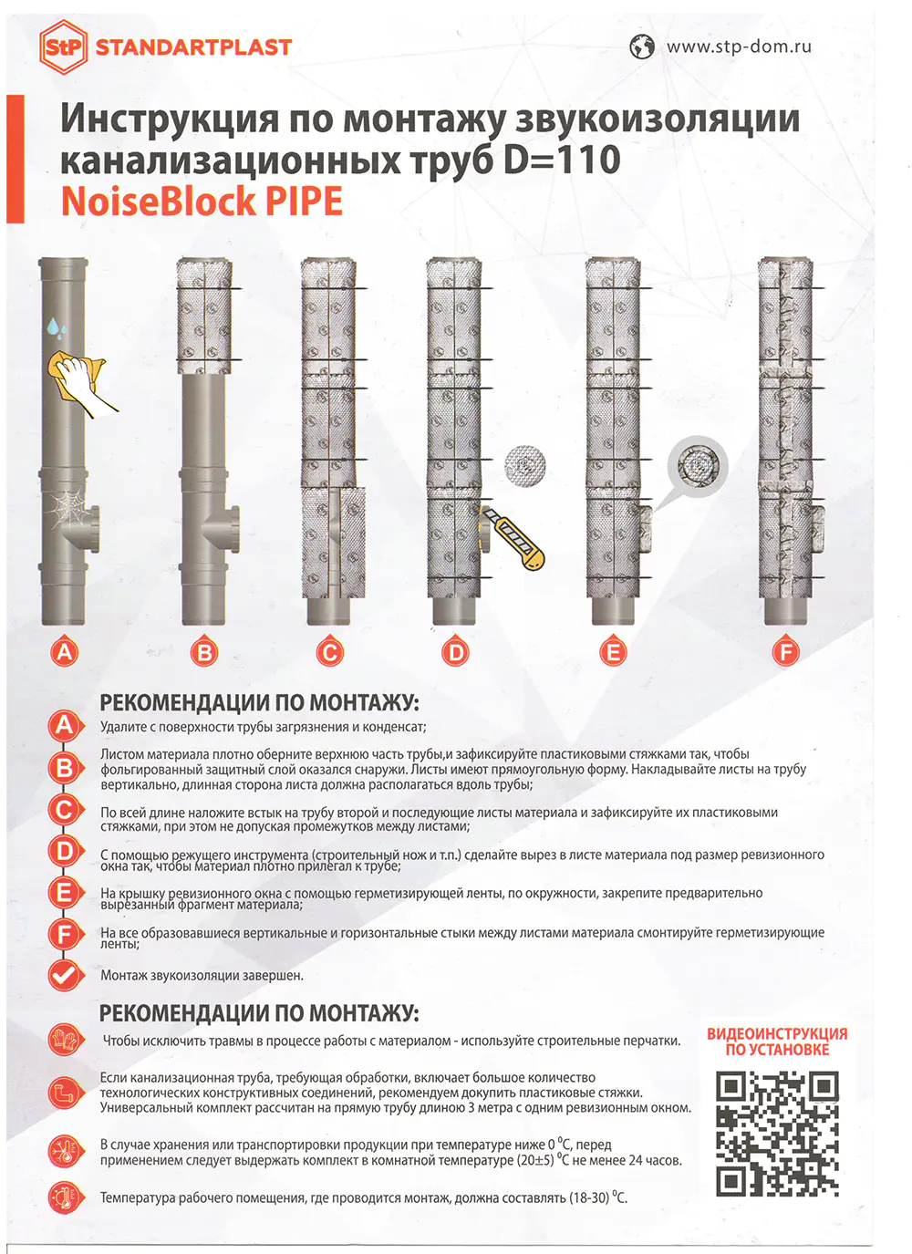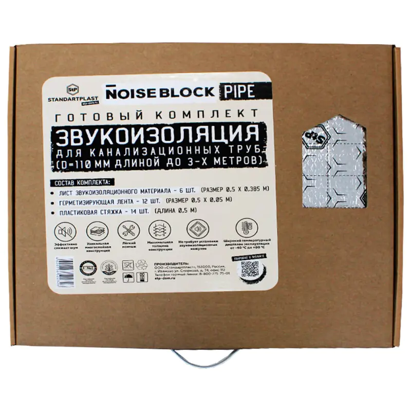 Звукоизоляция для канализационных труб NoiseBlock Pipe – высокотехнологичное изделие, сочетающее в себе уникальные звукоизолирующие свойства, теплоизолирующие свойства и удобство монтажа. NoiseBlockPipe предназначена для снижения шума систем водоснабжения и канализации. Также комплект можно применять для звукоизоляции вентиляционных каналов. Применяется как в новых, так и в реконструируемых системах, и может эксплуатироваться в широком температурном диапазоне от -30°С до +95°C. Комплект NoiseBlock Pipe рассчитан на трубу диаметром 110 мм и длинной до 3-х метров. В сравнении с распространенной на рынке теплоизоляцией труб из вспененного полиэтилена, которая практически не дает звукоизоляционного эффекта, решение NoiseBlock™Pipe снижает уровень шума в 2,5-3 раза.