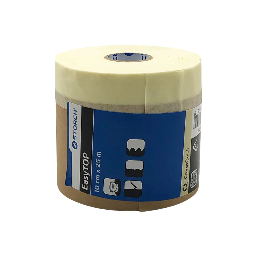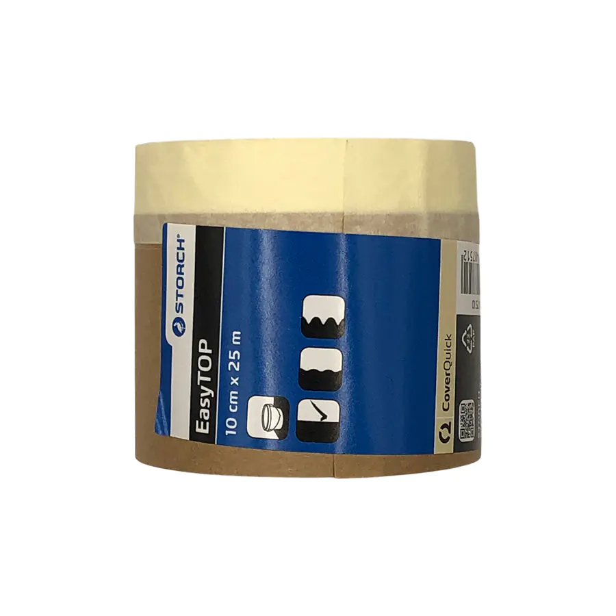 Бумага укрывочная с клейкой лентой STORCH CQ Papier. Применяется для укрытия потолочных плинтусов. Удобна в работе, экономит время, благодаря наличию клейкой ленты. Высота 10 см (рулон 6 см). Длина 25 м.