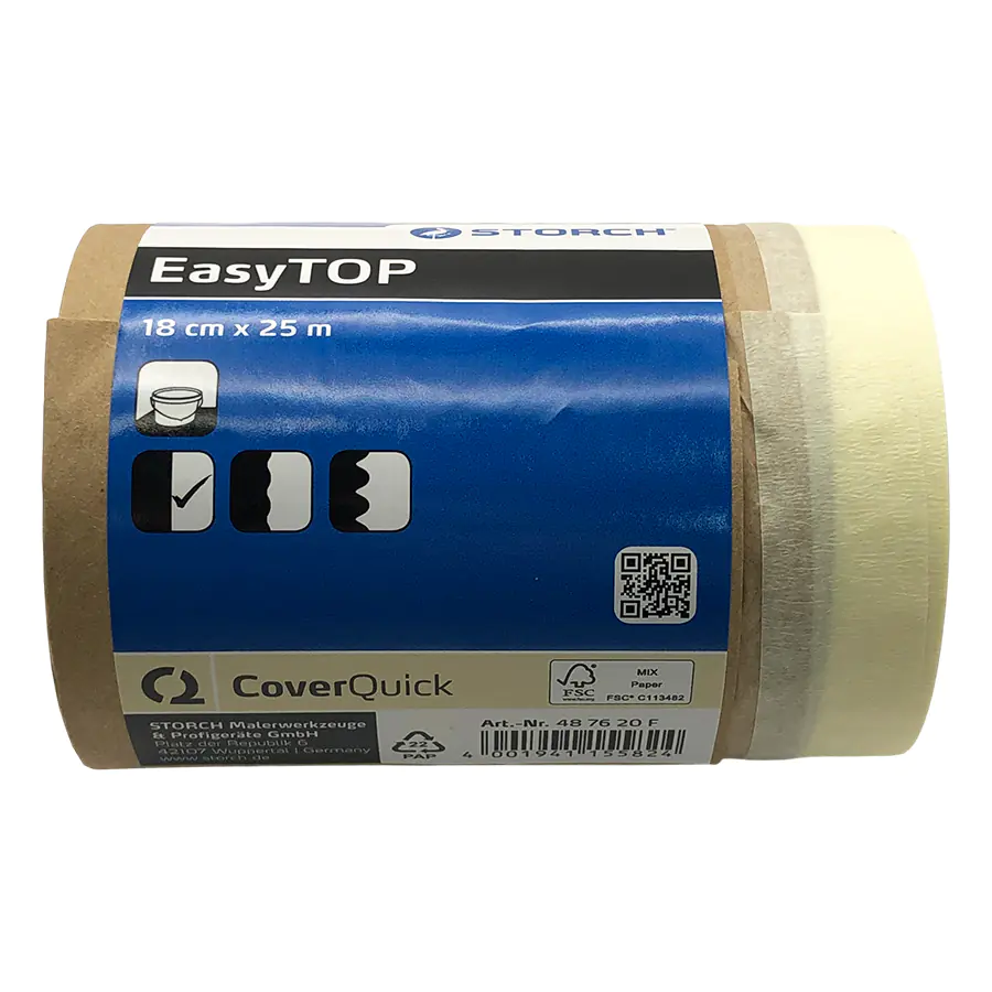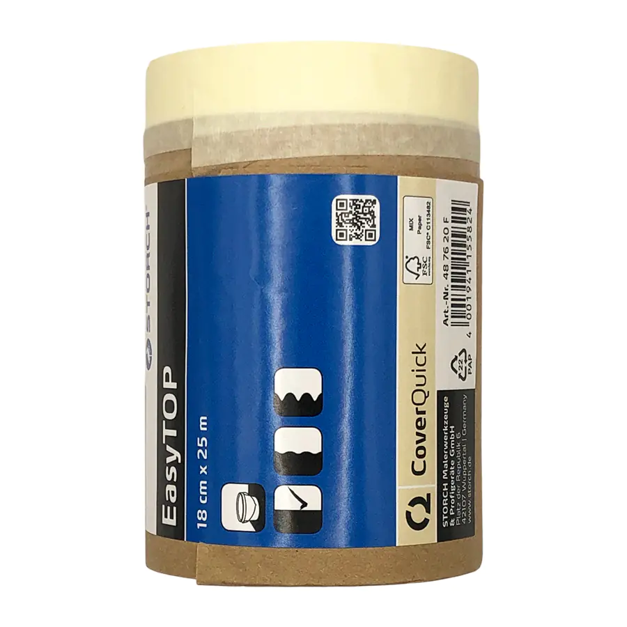 Бумага укрывочная с клейкой лентой STORCH CQ Papier. Применяется для укрытия потолочных плинтусов. Удобна в работе, экономит время, благодаря наличию клейкой ленты. Высота 18 см (рулон 10 см). Длина 25 м.