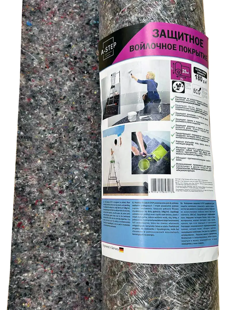 Предотвращает повреждение пола твердыми частицами бетона, песка и иных материалов, защищает от влаги, а также обладает противоскользящими свойствами. Простое и удобное в использовании. Плотность 180 г/м². Размер рулона 1х25 м.