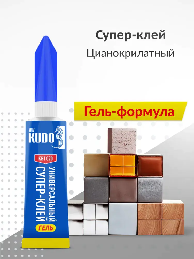 Универсальный цианоакрилатный супер-клей KUDO КВТ-020 низковязкий, однокомпонентный, предназначен для быстрого и прочного склеивания изделий из различных материалов, таких как пластик, керамика, резина, металл, кожа, дерево. Склеивает мгновенно. Благодаря особой консистенции позволяет корректировать место склейки. Предназначен для всех видов быстрых ремонтных работ в быту.