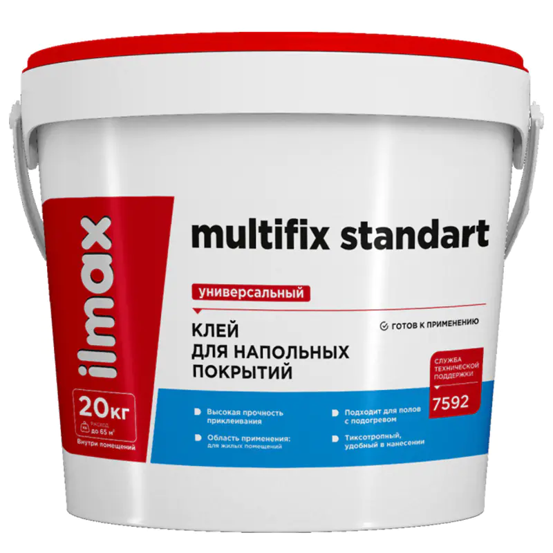 ilmax multifix standart – клей на основе дисперсии акрилового сополимера, которая обеспечивает стабильную прочность клеевого соединения и функциональных добавок. Не содержит растворителей и практически не имеет запаха. Клей предназначен для приклеивания напольных покрытий из ПВХ и вспененного винила в рулонах и плитке, текстильных и ковровых покрытий с различного вида подложками. Ориентировочный расход: 300–500 г/м² (при нанесении шпателем А2).