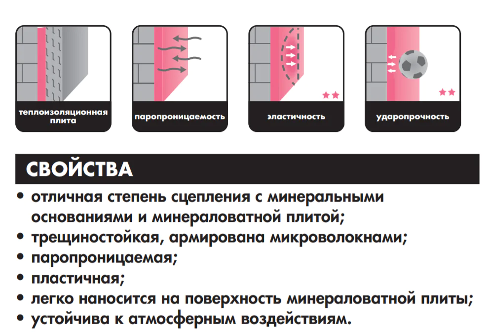 Отличная степень сцепления с минеральными основаниями и минераловатной плитой.
