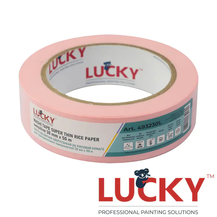 Lucky Washi Sensitive – это супертонкая лента из рисовой бумаги. У малярной ленты низкая адгезионная прочность с очень высокой прочностью во влажном состоянии. Суперделикатная. Данная лента разработана для гладких и слегка влажных поверхностей. Идеально подходит для финишной окраски. Размеры: 30 мм х 50 м.