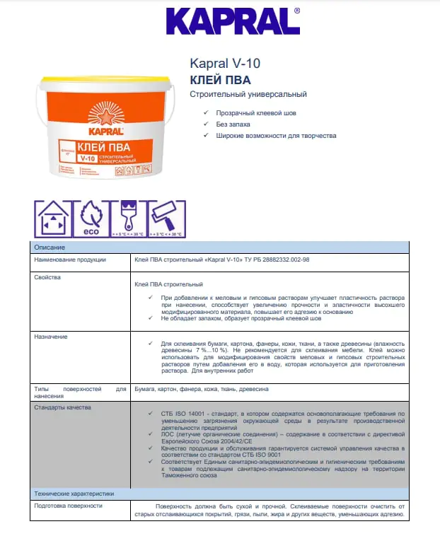 Для склеивания бумаги, картона, фанеры, кожи, ткани, а также древесины (влажность древесины 7 %...10 %). Клей можно использовать для модифицирования свойств меловых и гипсовых строительных растворов путем добавления его в воду, которая используется для приготовления раствора. Для внутренних работ.