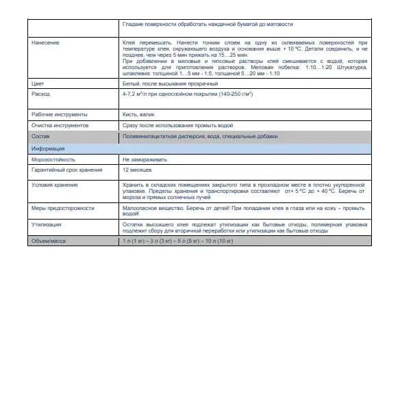 4. При добавлении в меловые и гипсовые растворы клей смешивается с водой, которая используется для приготовления растворов. Меловая побелка: 1:10…1:20 Штукатурка, шпаклевка: толщиной 1…5 мм - 1:5, толщиной 5…20 мм - 1:10.