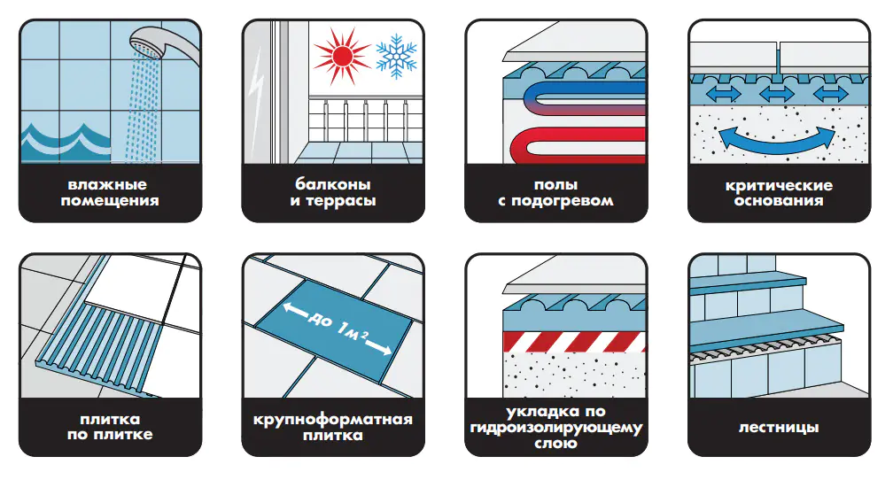 • керамическими и цементными плитками, керамогранитом. Указанные значения площади и формата плитки являются рекомендуемыми и могут быть изменены в зависимости от условий применения.