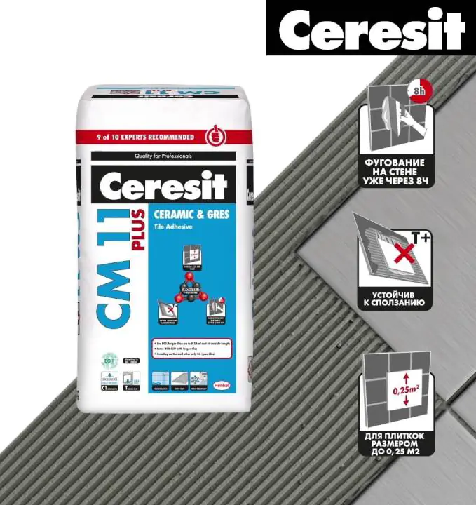 Смесь Ceresit CM 11 PLUS предназначена для облицовки недеформирующихся оснований керамической и цементной плиткой размером до 40х40 см и водопоглощением более 1% внутри и снаружи зданий, а также для приклеивания плиток размером до 40х40 см из искусственного камня, в том числе с водопоглощением менее 1% (грес) на недеформирующихся основаниях в помещениях с небольшими нагрузками. При укладке крупноформатной плитки с водопоглощением менее 1% (грес) внутри зданий (в том числе в помещениях с повышенными нагрузками) следует применять Ceresit CM 12. Для обогреваемых полов и по подплиточной гидроизоляции (продукты группы CL, CR) необходимо использовать Ceresit CM 14, CM 16. Плитки из мрамора и других светлых крупнокристаллических пород склонных к изменению цвета необходимо укладывать с помощью Ceresit CM 115, CM 74, CE 79.