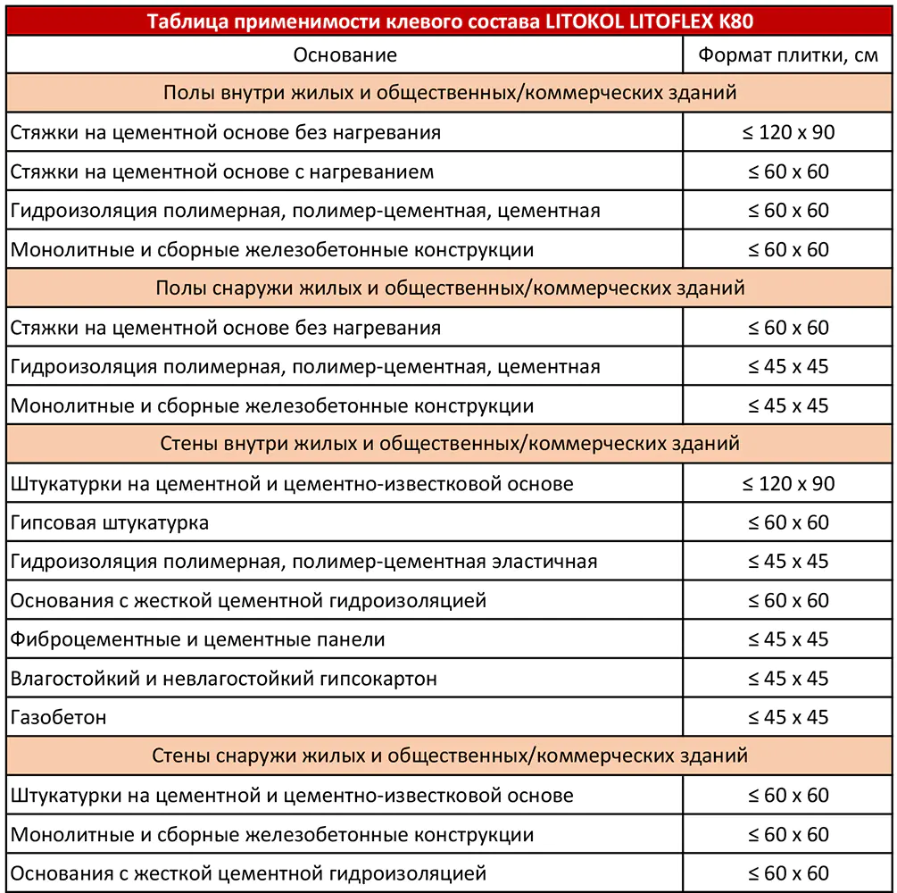 LitoFlex K80 предназначен для укладки керамогранита, керамической плитки, клинкера, натурального камня с устойчивой структурой как на стабильные основания, так и на основания, подверженные деформации, в том числе и методом укладки "плитка на плитку".