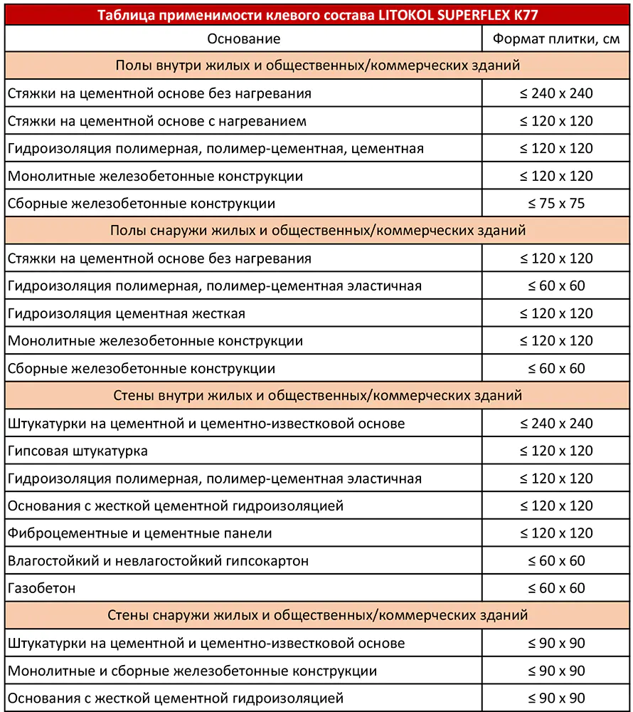 SuperFlex K77 — клеевая смесь, предназначенная для укладки любого типа плитки из керамогранита, керамики и натурального влагоустойчивого камня, в том числе большого формата. Применяется при внутренней и наружной облицовке стен и полов. Рекомендуемые основания: